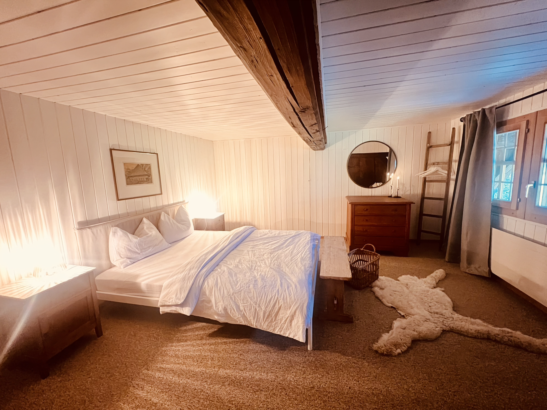 Während die Alpakas draussen ums Haus grasen, kann man drinnen mit dem Alpaka-Wollduvet kuscheln oder draussen gemütlich in der Hängematte liegen und die Tiere beobachten. Das Ferienhaus ist für kleine wie auch grössere Gäste geeignet.