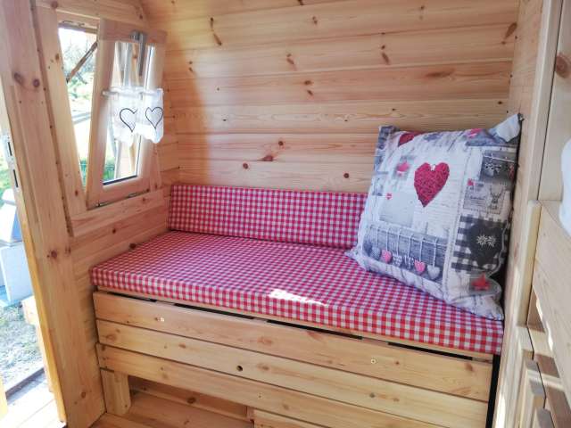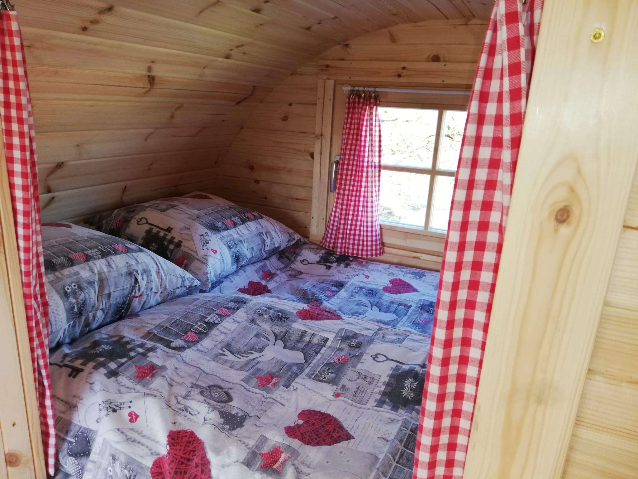 Sie schlafen in einem französischen Bett (2 Erwachsene), Kinder können auf den Schlafplätzen auf den Sitzbänken schlafen (nur 130cm lang!). Bett- und Frotteewäsche sind vorhanden, für Kinder müssen Schlafsäcke mitgenommen werden. Das gemütliche Wohnfass bietet eine ausziehbare Tischplatte mit zwei Sitzbänken an der Wand, Stauraum unter dem Bett und den Sitzbänken, Strom (1 Lampe, 1 Steckdose, 1 kleiner Elektro-Ofen zum Heizen falls es kalt wird), Campingausrüstung (ein Campingkocher mit 2 Platten, Campinggeschirr, kleiner Kugel-Grill sowie 2 Tische und Stühle) ein WC mit Lavabo, sowie eine einfache Dusche mit separatem Eingang auf Bauernhof, ein Kühlschrank mit Gefrierfach und ein gemütlicher Sitzplatz mit Cheminée mit Holz zum Grillieren.
