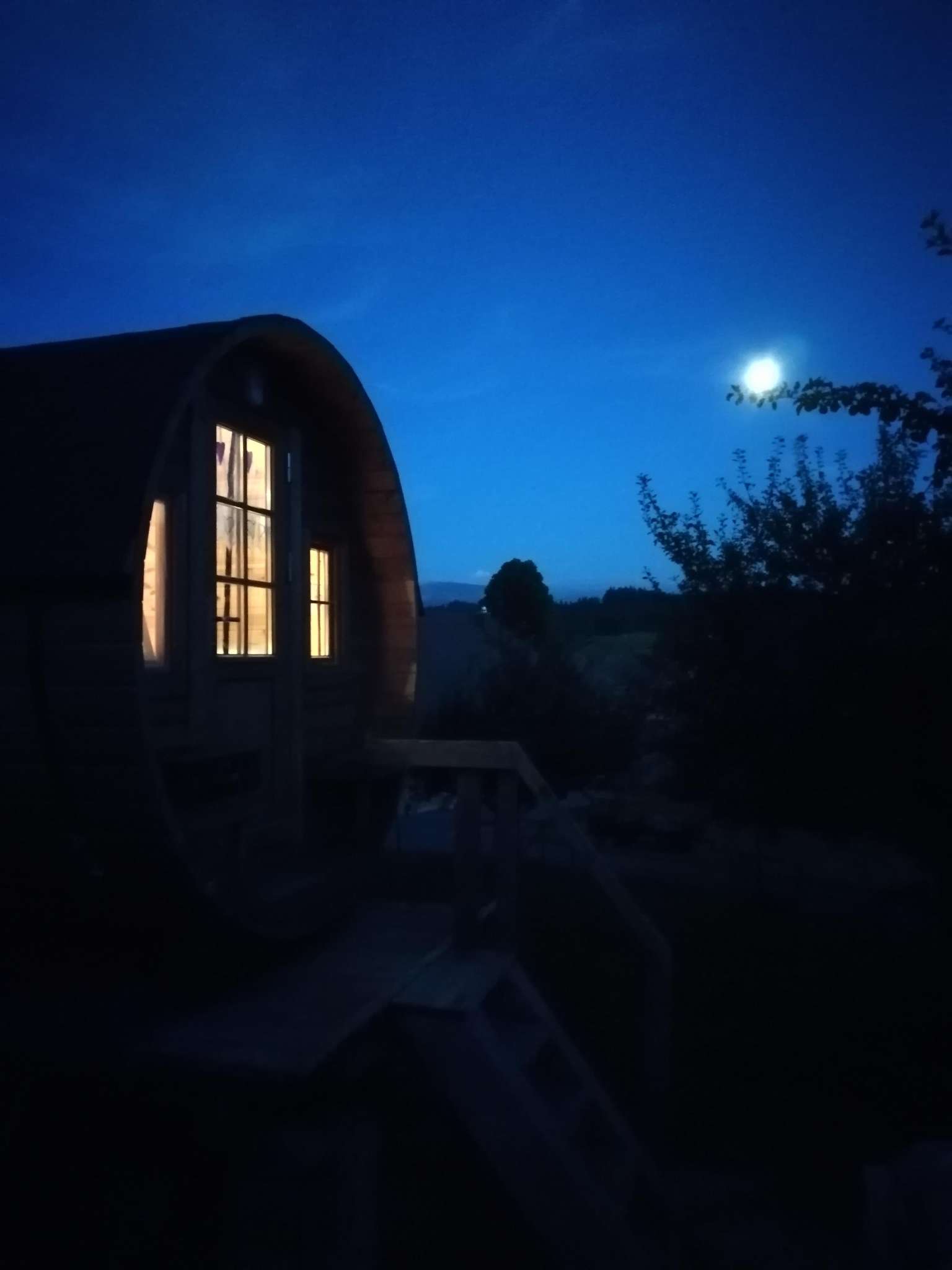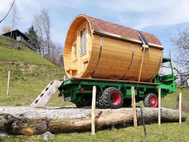 Das Fass ist oberhalb des Bauernhofes in einer Weide zwischen Bäumen platziert und zu Fuss erreichbar. Es liegt 40 Meter vom Hof entfernt. Ab und zu sind eine Mutterkuhherde oder Ziegen auf der Weide. Doch was gibt es herrlicheres als bei Glockengebimmel einzuschlafen!? Idyllisch wie bei Alpöhi und Heidi - dazu geniessen Sie den Sonnenuntergang und die Weitsicht über das Emmental. Wenn Sie mit dem Auto anreisen, können Sie das Auto auf dem Hof Ober Mörisegg parkieren. Auf Wunsch holen die Gastgeber die Gäste am Bahnhof Zollbrück ab. Zu Fuss erreichen Sie den Hof ab Bahnhof Zollbrück in 1.5 Std. Oder ab der Lüderenalp Richtung Zollbrück auf einer wunderbaren Höhenwanderung in 1.5 Std.