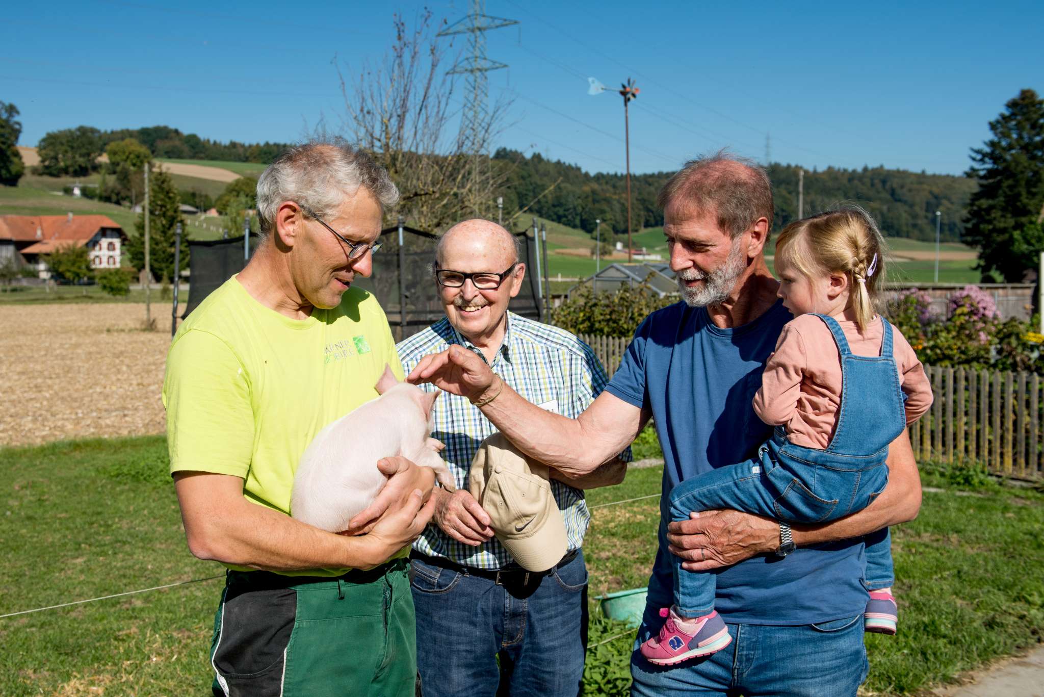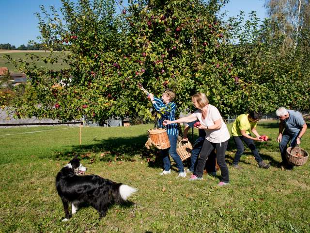Kaffee, Tee, Süssmost, hausgemachtes Brot oder Zopf im Freien (unter Dach) und mit Trockenwurst und/oder Speckzüpfe sowie mit Infos über den Landwirtschaftsbetrieb und Garten.