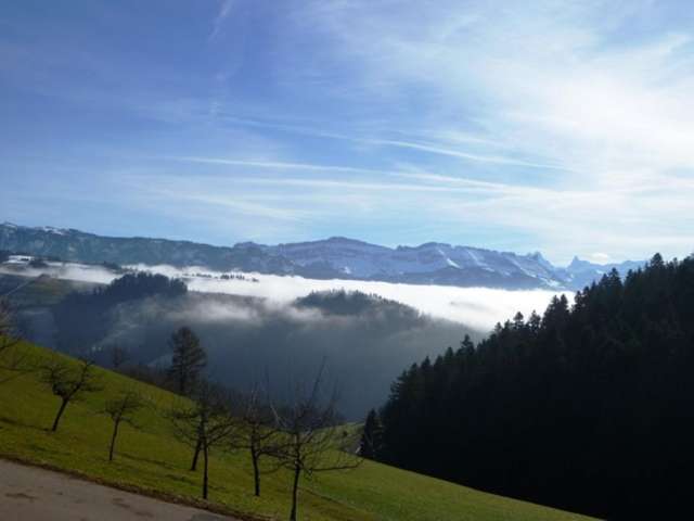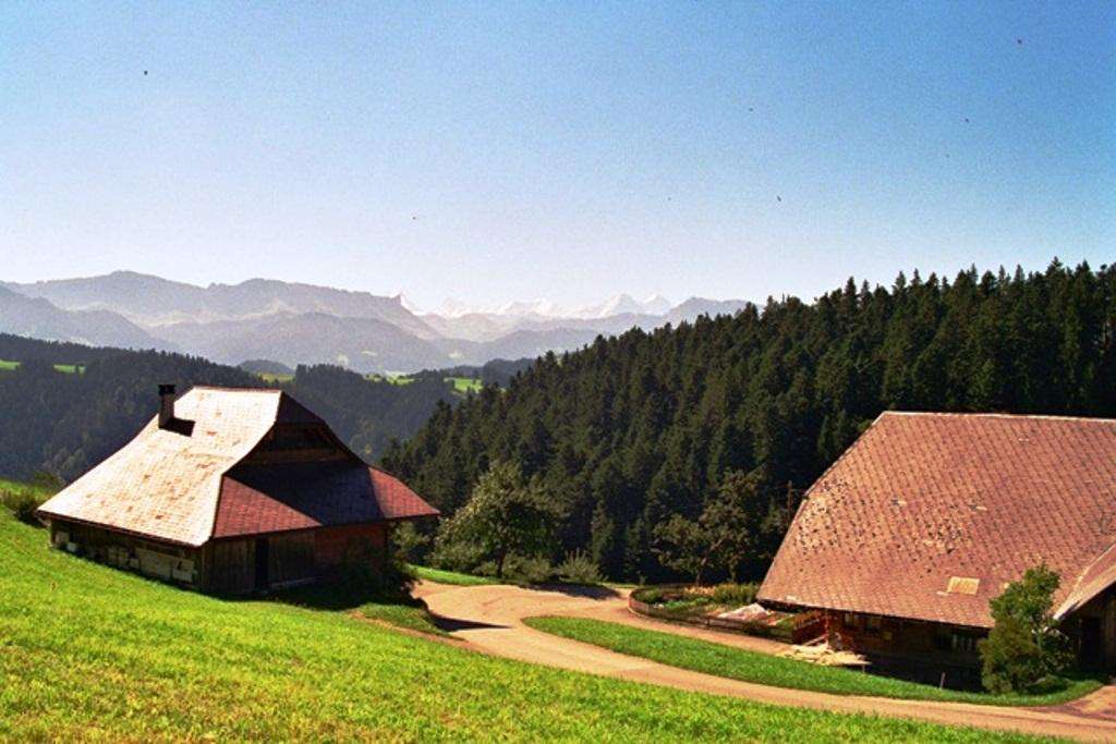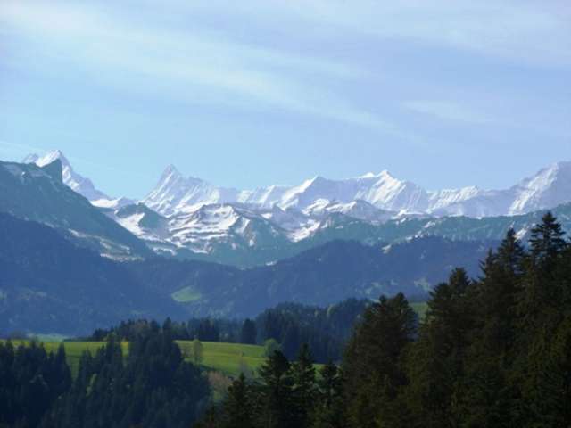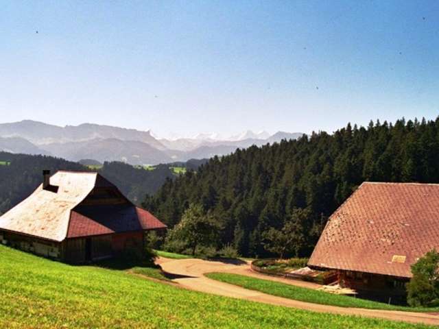 Der Bauernhof liegt auf 1000 m.ü.M und bei guter Sicht mit tollem Blick auf die Berner Alpen.
