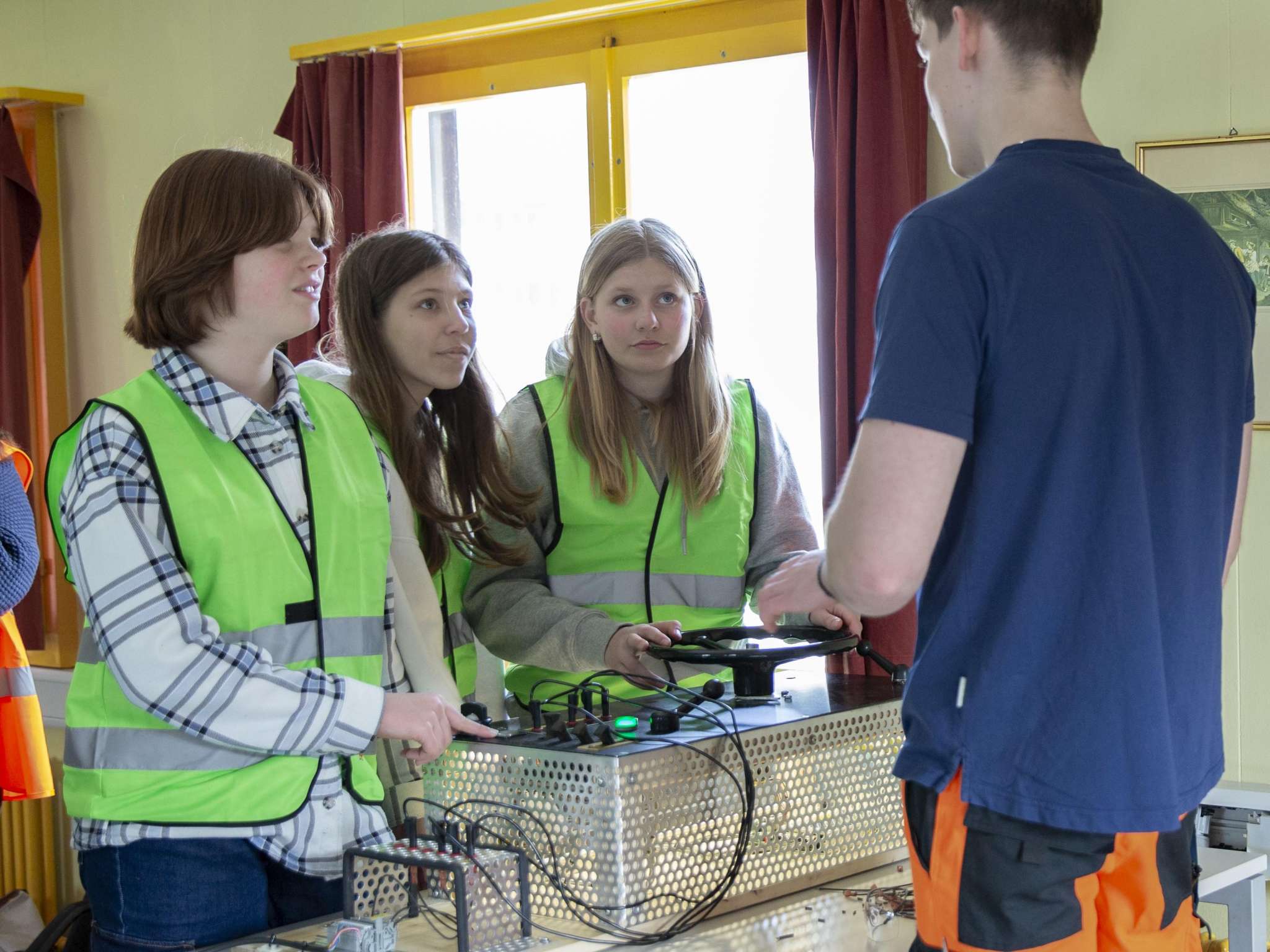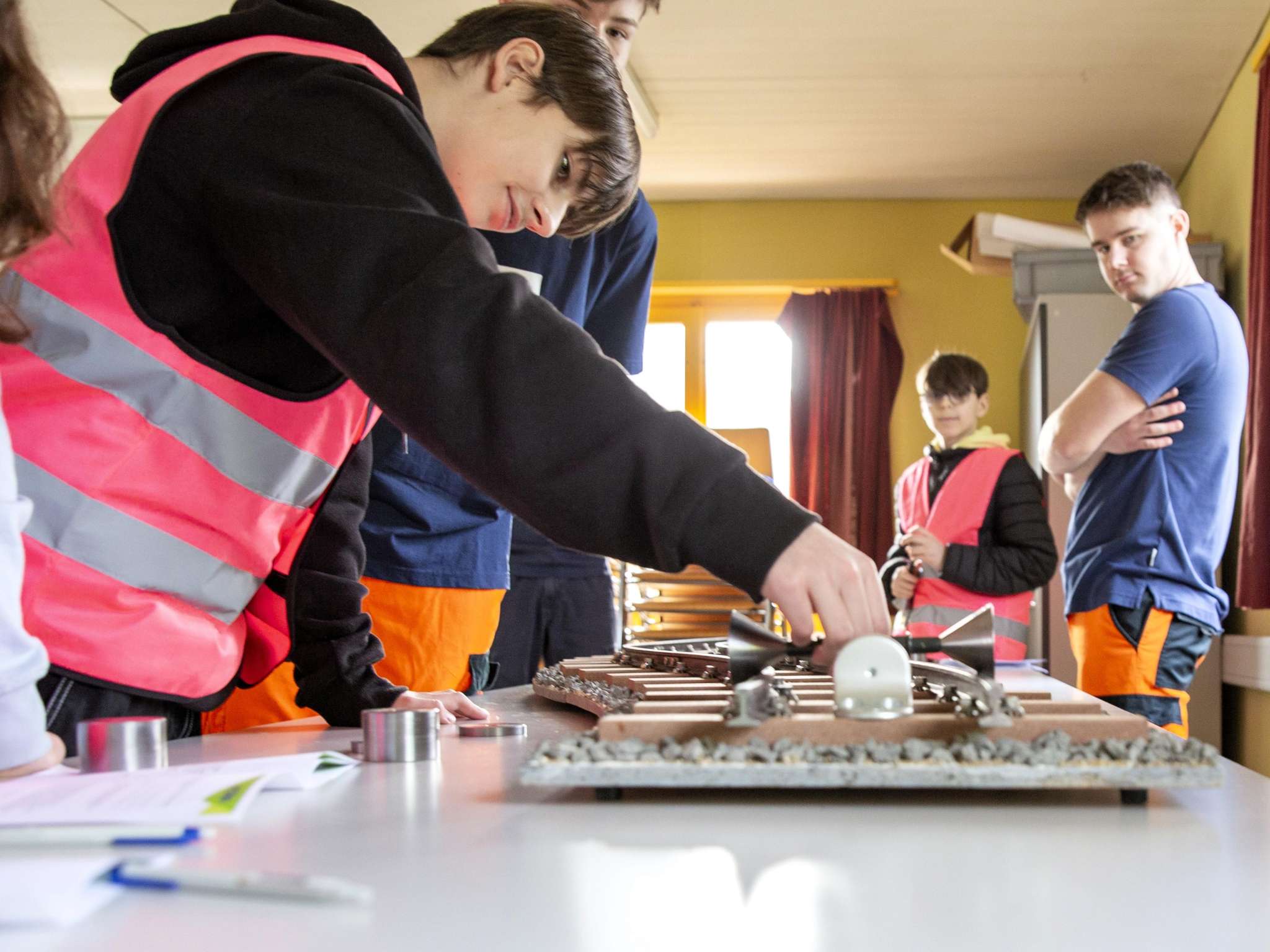 Die Tour beginnt am Bahnhof Oberburg und führt zur Werkstatt, wo die BLS-Lernenden der Schulklasse einen Einblick in die verschiedenen Berufslehren geben. Dabei erfahren die Schüler:innen, wie die Instandhaltung der Fahrzeuge organisiert ist und welche Arbeiten in der Werkstatt Oberburg vorgenommen werden. Eine Gruppenhälfte wird durch die Werkstatt und die Fahrzeuge geführt während die andere Hälfte mittels verschiedener Posten einen Einblick in den Berufsalltag der Mitarbeitenden erhält. Anschliessend werden die Gruppen getauscht. An den verschiedenen Posten, die von den Lernenden erstellt wurden, erfahren die Schüler:innen unter anderem, wie ein Stromkreis funktioniert und sehen anhand konkreter Beispiele, wie das Hebelgesetz im Alltag helfen kann.