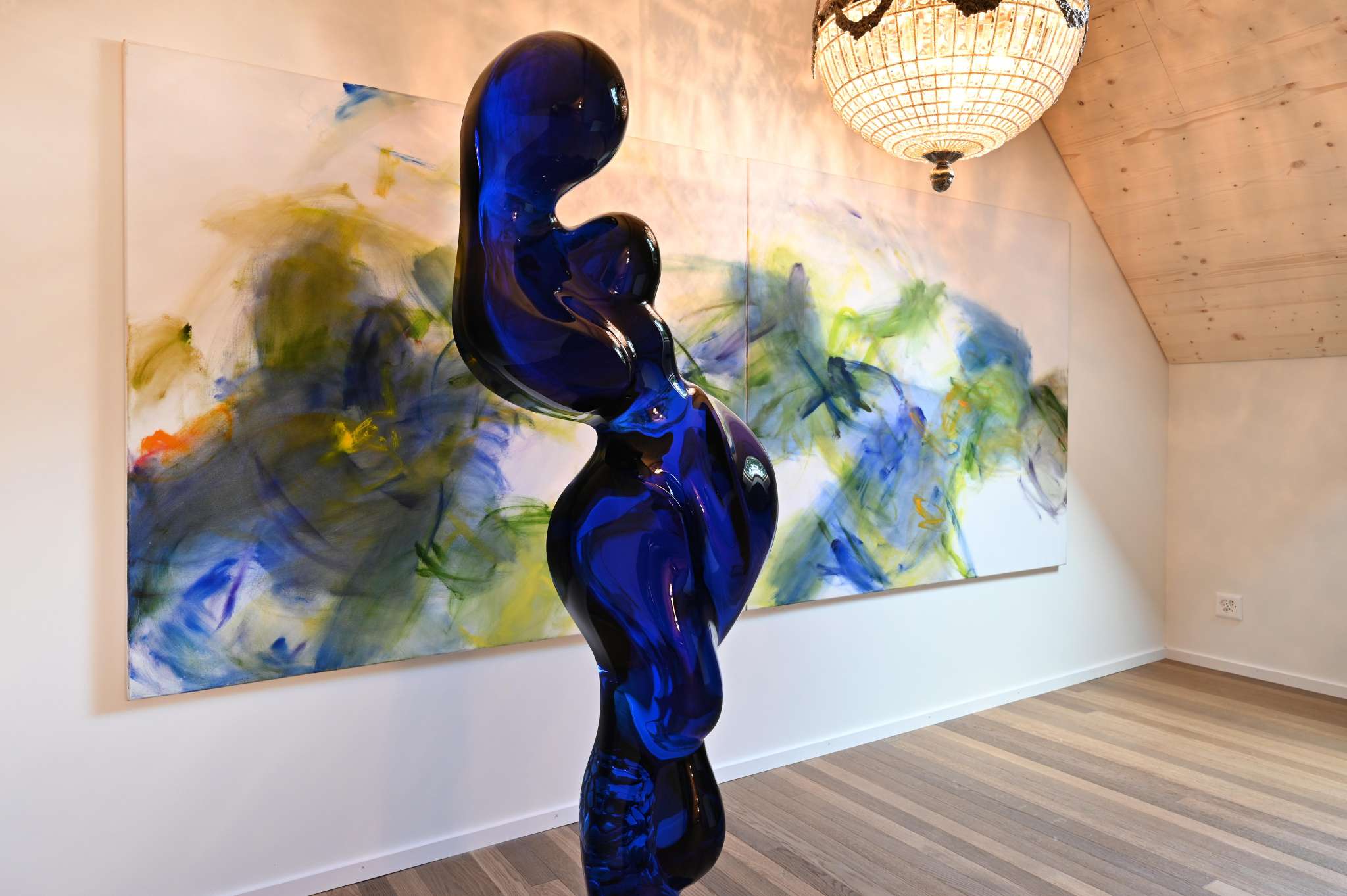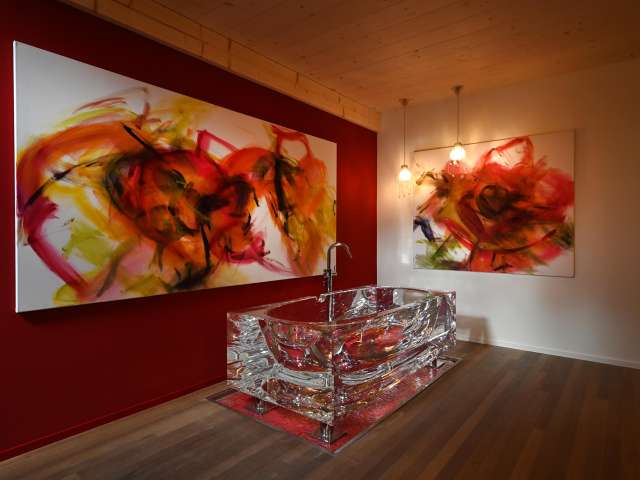 Kunst ist das Herzstück des Roggegratbads. In der hauseigenen BLUE-art Galerie, die nur auf Voranmeldung besucht werden kann, sind Werke von Brigitte Buck Litscher und Heiko Schütz ausgestellt – ergänzt durch Objekte regionaler Kunstschaffender.