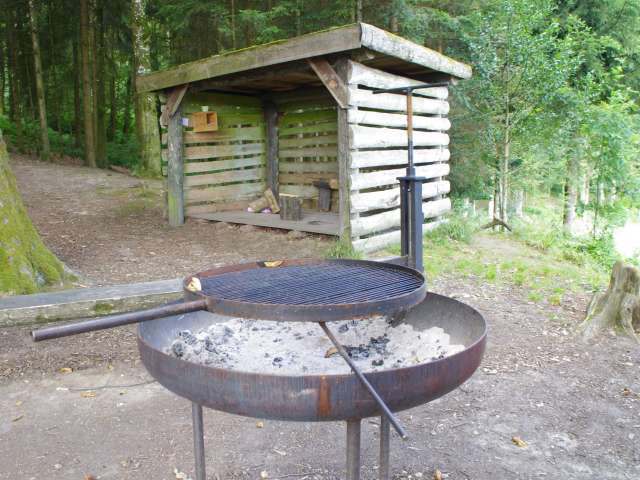 Grosse Brätlistelle mit installiertem Grill, Holztischen und Bänken sowie einem Holzschuppen.