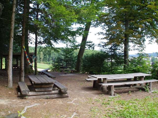 Wer dem Wanderweg am Waldrand entlang geht, kann diese Brätlistelle leicht verpassen. Zwischen Büschen hindurch führt eine Naturtreppe in paar Meter ins Innere des Waldes. Dort finden Sie ein idyllisches Plätzchen. An zwei grossen Picknicktischen und drei Sitzbänken lässt sich wunderbar verweilen und essen. Der Grill ist klein, aber praktisch. Die Brätlistelle kann sogar reserviert werden – indem man sich in die Agenda einträgt, die im Holzschuppen hängt. Oft lagert im Schuppen zwar kaum Brennholz, aber das ist kein Problem. Schliesslich liegt im Wald genügend Holz herum.