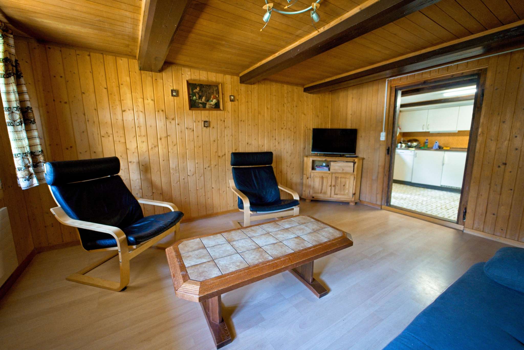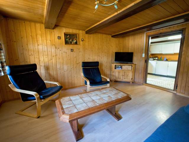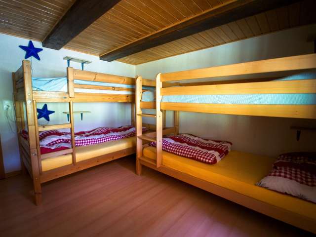Im Obergeschoss des Stöcklis befindet sich eine 3 1/2 Zimmer Ferienwohnung. Sie hat ein Doppelzimmer (auf Wunsch mit Kinderbett), ein Kinderzimmer mit zwei Kajütenbetten und ein Wohnzimmer mit ausziehbarem Sofa und TV. Eine grosse, komplett eingerichtete Wohnküche, ein Badezimmer und eine Laube mit Eckbank und Spielecke sorgen für erholsame Ferien. Draussen erwartet die Gäste ein gut ausgestatteter Sitzplatz mit Grillmöglichkeit sowie ein Trampolin, Kinderschaukel und viele Tiere.