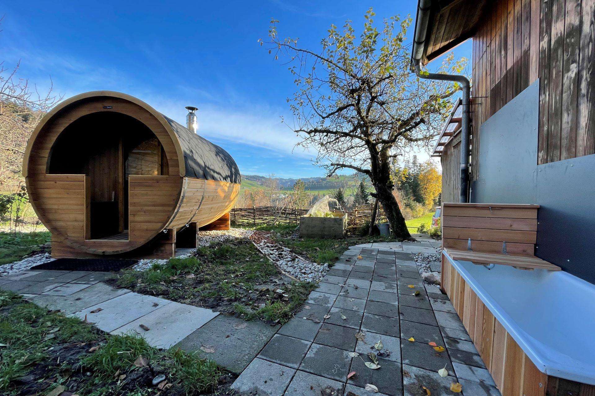 Sie können von einem genussvollen Wellness- und Hofprodukteangebot profitieren. Die Fasssauna bietet Platz für 2 bis 4 Personen und bildet zusammen mit dem Kneippweg, einer Aussendusche und dem Eisbad eine kleine aber feine Wellnesslandschaft. Die Sauna kann auch während 180 Minuten von Tagesgästen gebucht werden: RESERVATION SAUNA