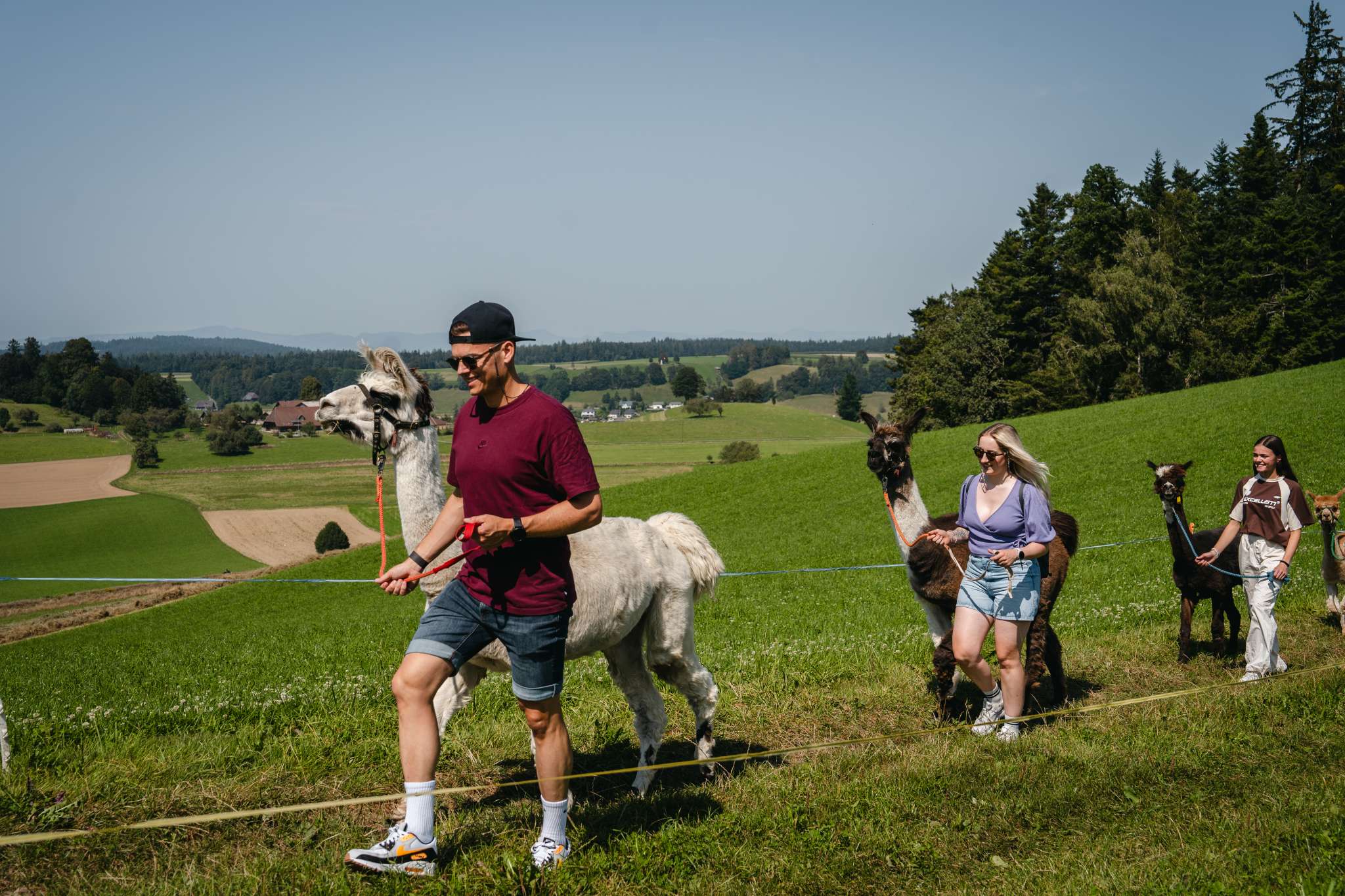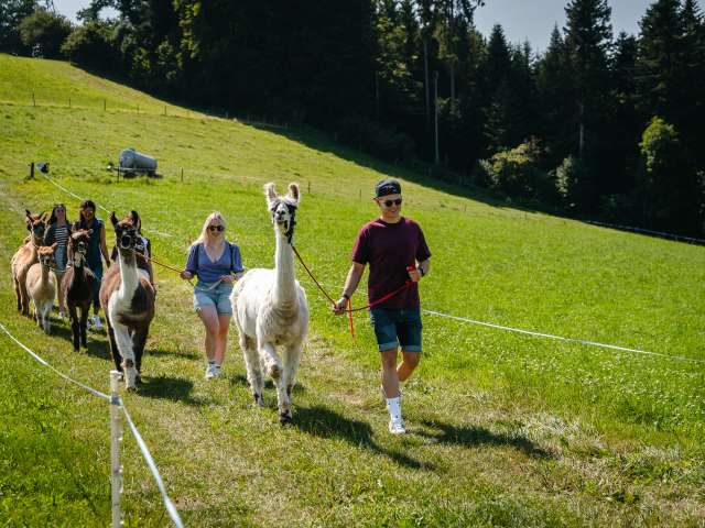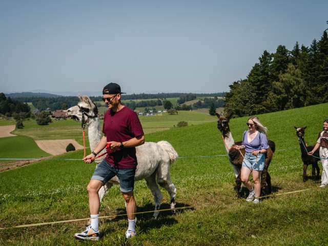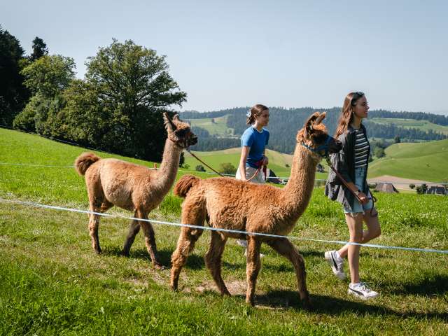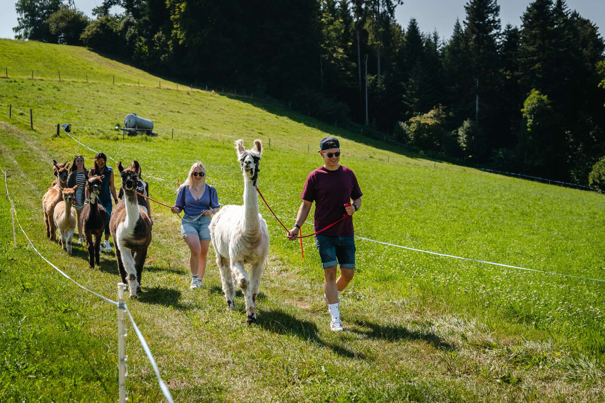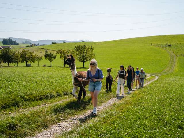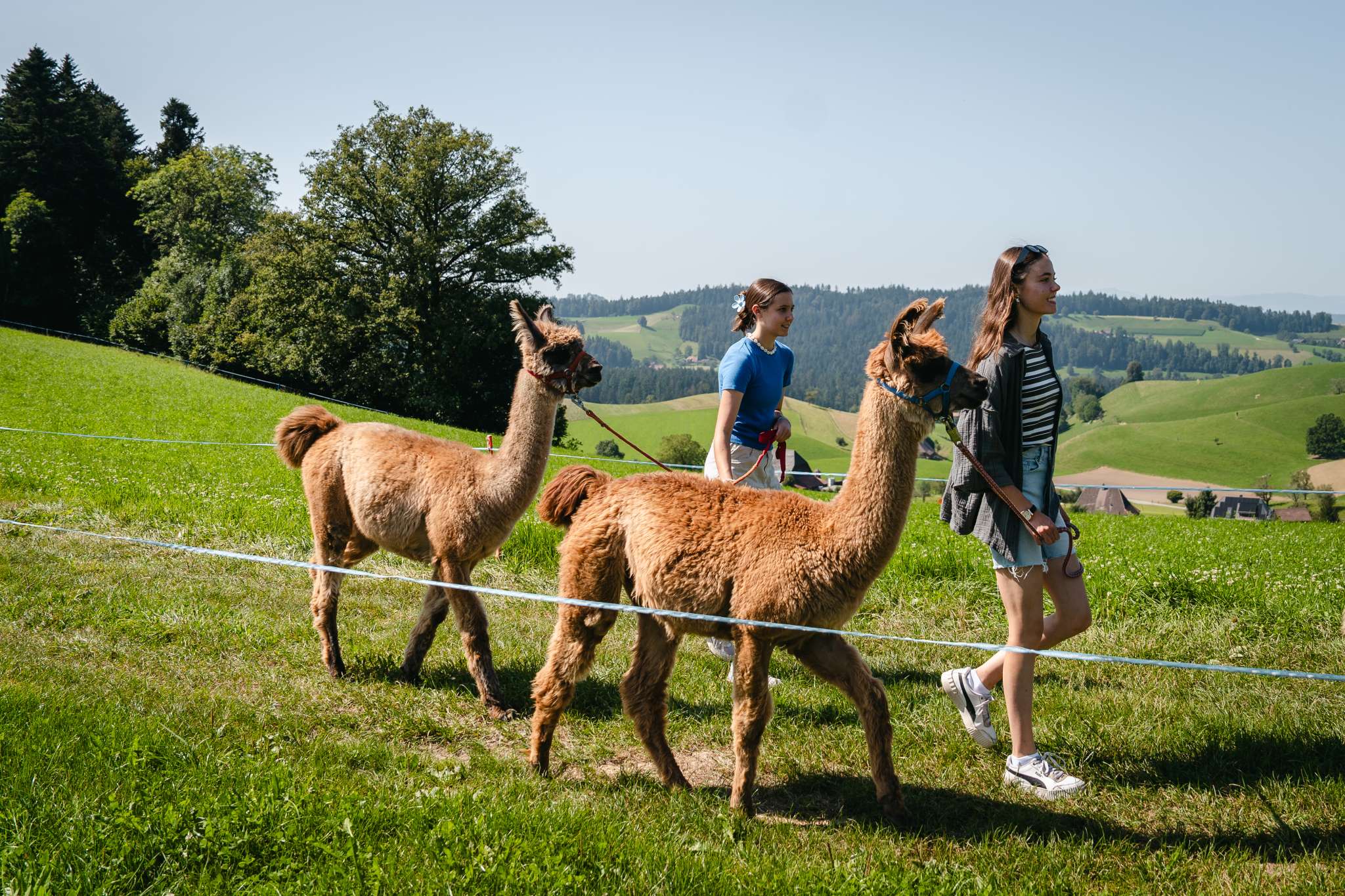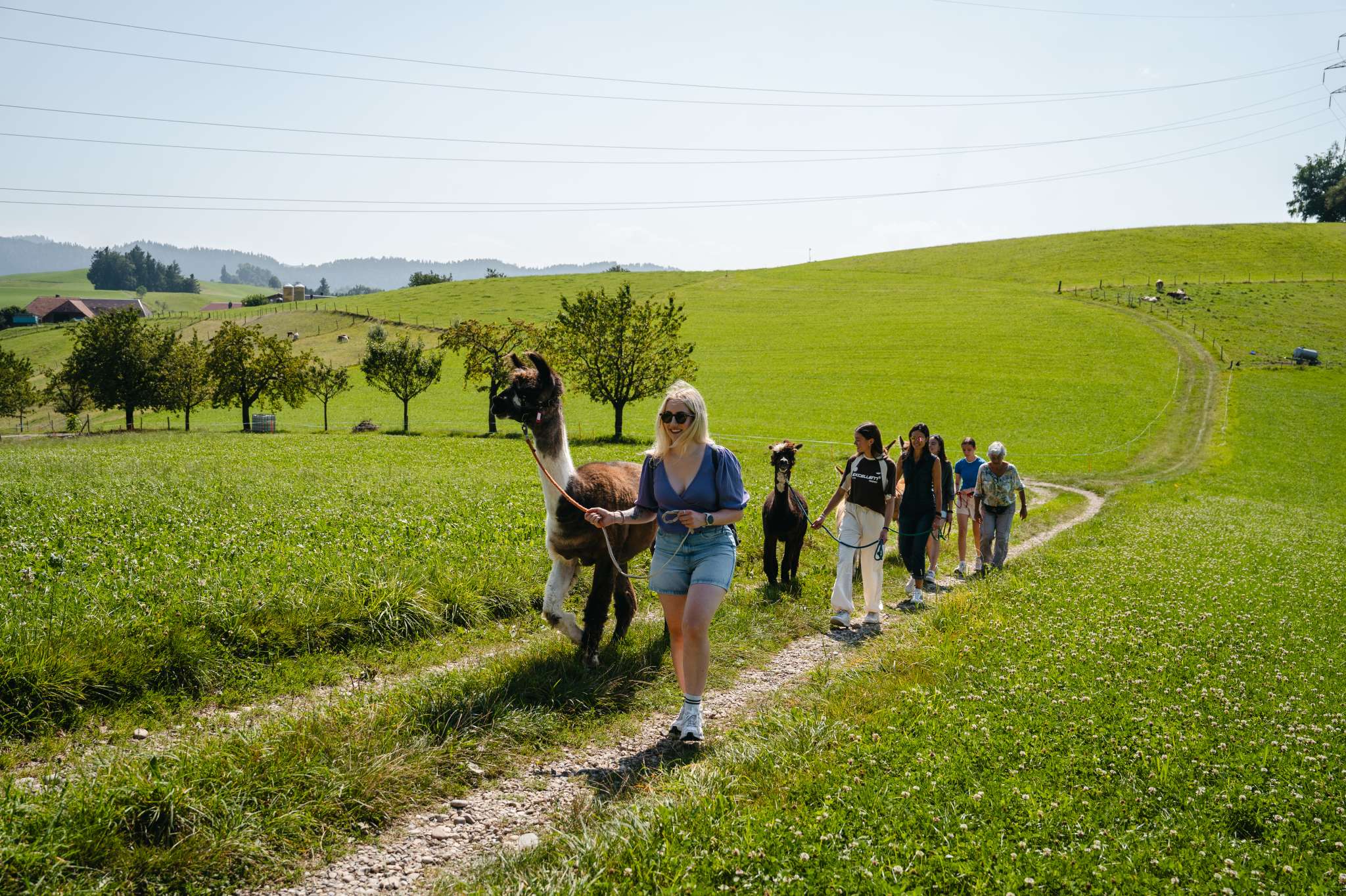 Lamas, die zur Gattung Kamele gehören, sind in Südamerika beheimatet. Das schweizerische Klima behagt ihnen sehr. Ihr sanfter, gutmütiger Charakter begeistert immer wieder. Du hast auf dem Lamahof Tschäppel die Möglichkeit mit diesen Tieren näher in Kontakt zu kommen und eine Wanderung mit den Lamas und einer Begleitperson zu absolvieren. Die Lamawanderungen sind als Gruppenaktivität buchbar. Einzelpersonen können sich bei den rund 12 öffentlichen Lamawanderungen pro Jahr anmelden.