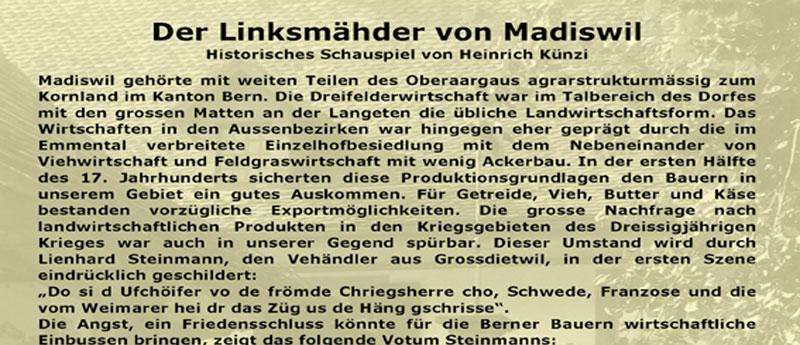 Erzählt von Ueli, dem Linksmähder, und ist eine alte Sage von Madiswil. Es gibt verschiedene Varianten, eine davon erzählt folgendes: Es war einmal ein reicher Bauer. Der hatte eine bildschöne Tochter namens Vreni, welche vielen Männern gefiel - auch Ueli, der bei ihrem Vater um ihre Hand anhielt. Vreni's Vater wollte sie aber nicht so leicht weg geben und forderte Ueli auf, ein Kreuz in die Grossmatt zu mähen. Weil er gut mit der linken Hand mähen konnte, musste er dies auch links herum tun. Er ging eifrig an die Arbeit, bis er plötzlich ein Schlag im Herz spürt. Dies musste seine alte Kriegswunde sein! Er war beinahe fertig und strengte sich an für den letzten Streich. Doch dieser kostete ihm das Leben.