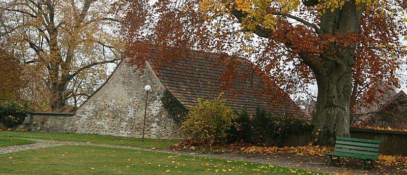 1728 wurde die heutige Saalkirche an den alten, gotischen Turm der abgebrochenen Kirche angebaut, 1912 das Glasgemälde-Triptychon «Bergpredigt» nach Kartons von Eugène Burnand ausgeführt.