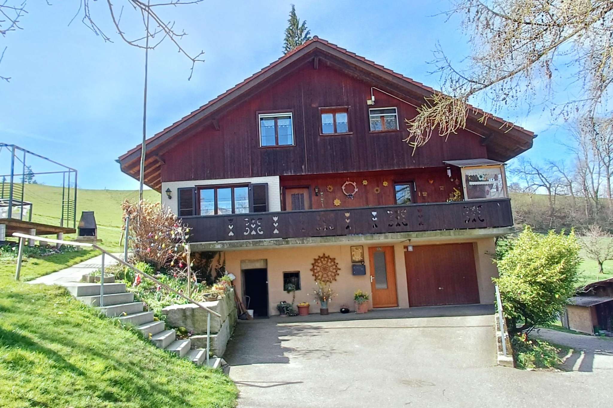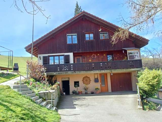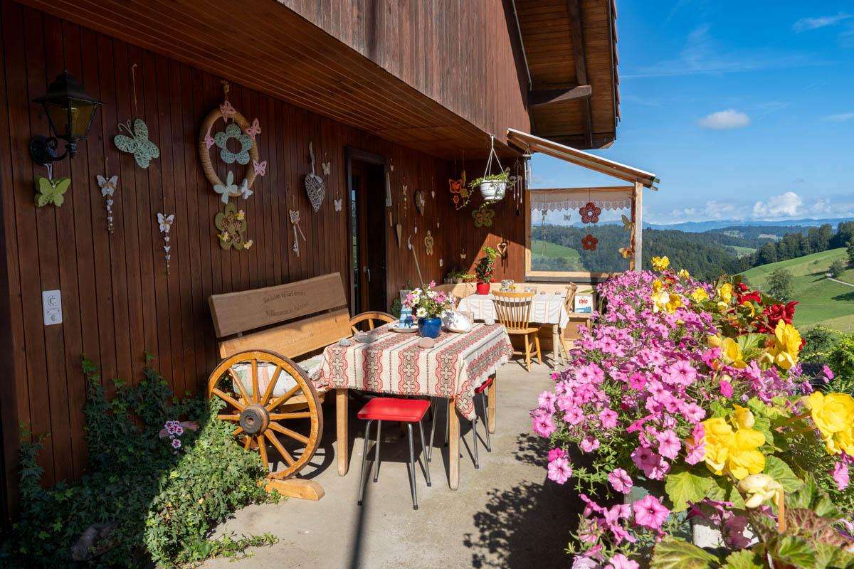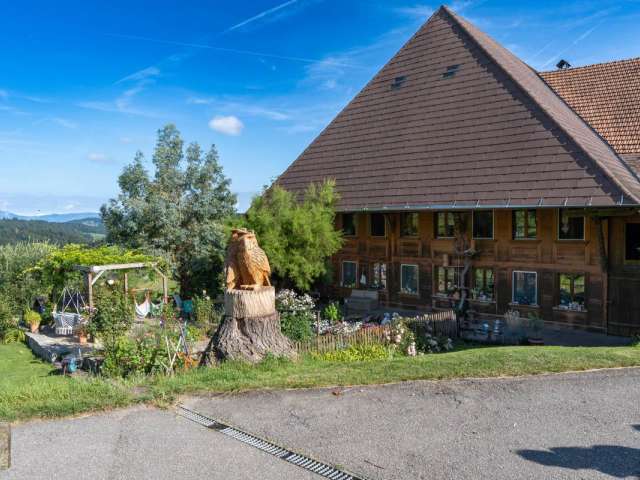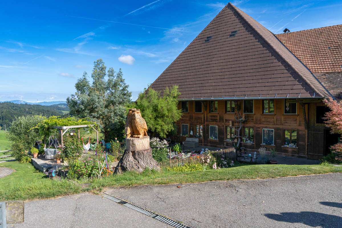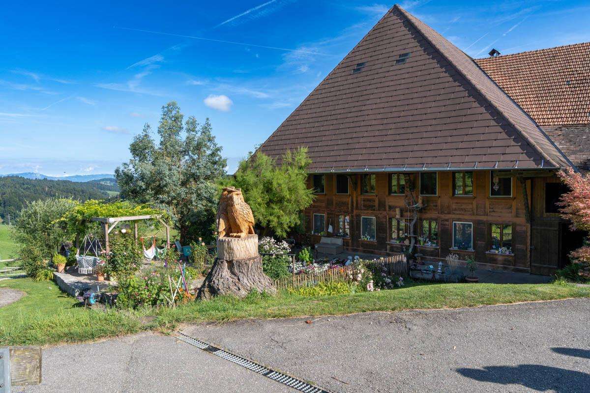 Der Hof, eingebettet in die Hügel am Rande des Emmentals nahe Huttwil, bietet eine atemberaubende Aussicht auf die Alpen und spektakuläre Sonnenuntergänge über dem Jura.