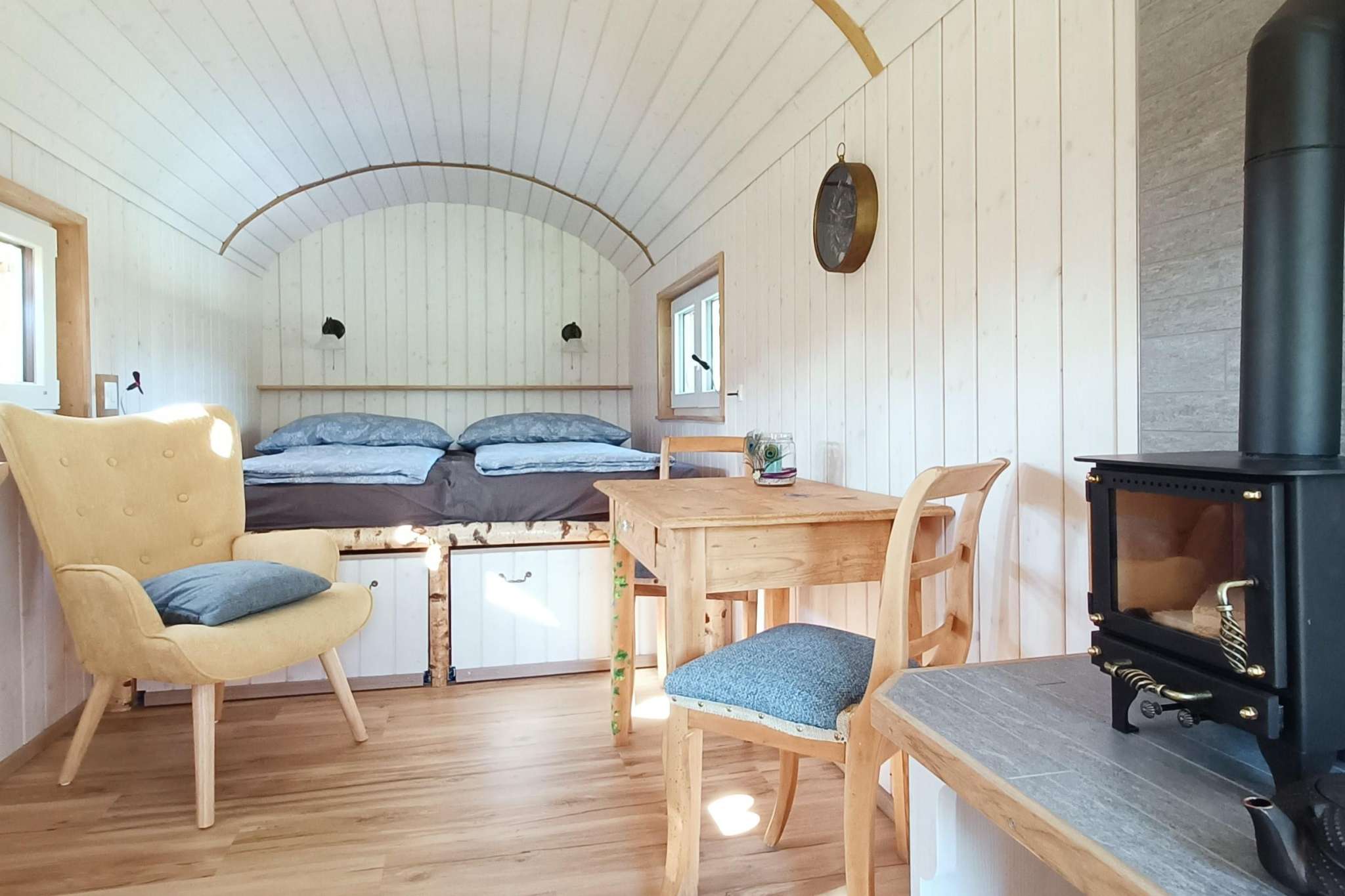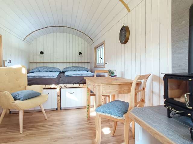 Der Zirkuswagen ist mit einem Doppelbett ausgestattet, und für kleine Gäste steht eine Luftmatratze zur Verfügung. Im Wagen gibt es fliessendes Wasser, und bei Bedarf kann auf dem Hof geduscht werden. Als Toilette steht eine Trockentrenntoilette zur Verfügung. Eine Kochgelegenheit gibt es draußen auf einem Campingkocher oder direkt über dem Feuer. Für diejenigen, die nicht selbst kochen möchten, stehen verschiedene Restaurants in der Umgebung zur Verfügung.