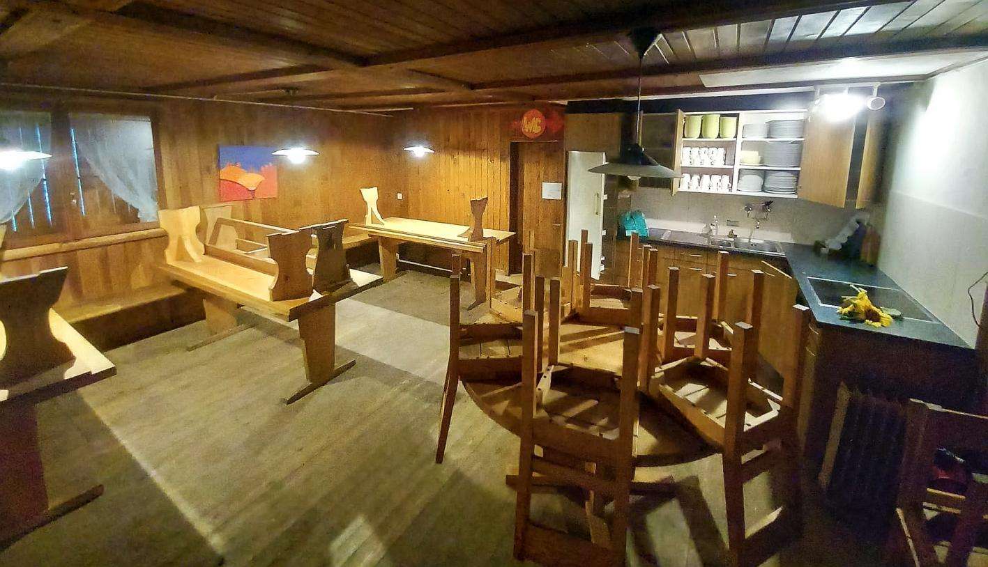 Der Innenraum bietet für ca. 25 bis 30 Personen Platz. Es hat eine Kochnische mit allem was dazu gehört (Geschirr, Besteck, Kochherd, Backofen, Kühlschrank) und ein Cheminée. Aussen befindet sich eine gedeckte Grillstelle und weiteren Sitzgelegenheiten.